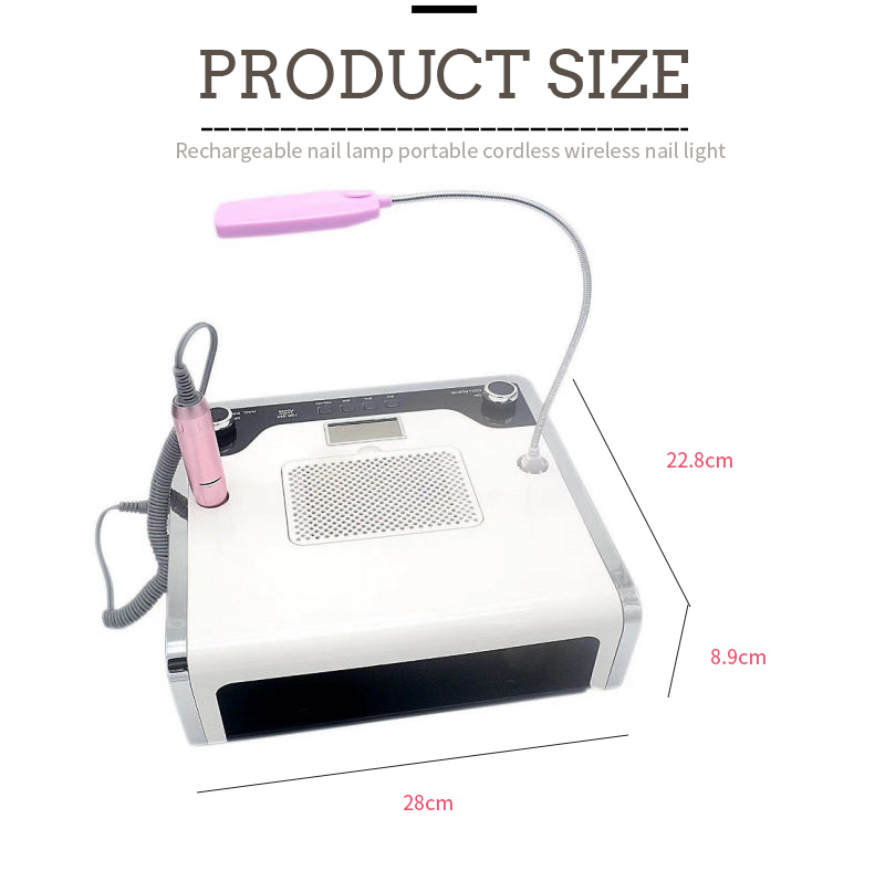 Las dimensiones de esta lámpara de uñas multifunción 4 en 1 son 280 mm de largo, 228 mm de ancho y 89 mm de alto, con una gran capacidad y posibilidad de utilizar tanto manos como pies, lo cual resulta muy conveniente.