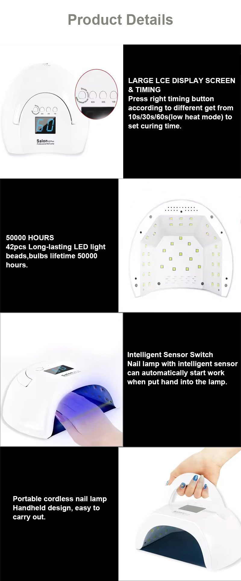 Nuestros principales productos incluyen lámparas de uñas LED: 186W/168W/86W/84W/80W/75W/72W/65W/60W/54W/50W/48W/36W/24W/16W/12W/6W/3W, etc. Modelos inalámbricos recargables: 156W/120W/96W/90W/86W/84W/80W/72W/66W/64W/60W/54W/48W, etc. Taladros para decoración de uñas: 80W/65W/60W/45W/35W/25W/15W, etc. Modelos de carga inalámbrica: 45W, 35W, 30W, 25W, 20W, 15W, etc. 25000RPM/30000RPM/35000RPM/40000RPM/45000RPM/sin escobillas/sin escobillas de velocidad ultraalta. Colector de polvo completo. 80W/68W/60W/48W/45W/40W/36W/30W/25W/20W/15W/6W, etc. Modelos de carga inalámbrica: 80W, 60W, 40W, 30W.