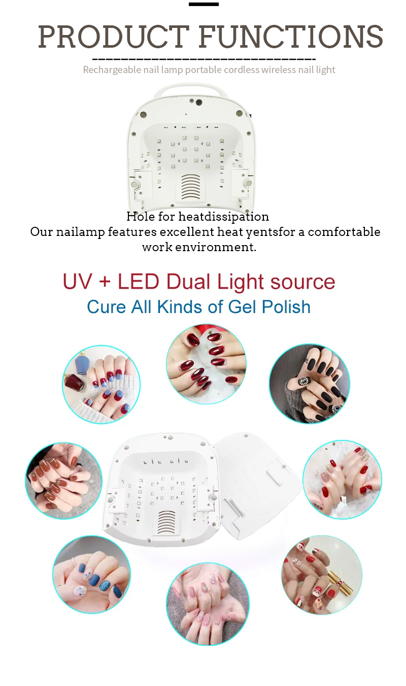 El producto garantiza un secado uniforme del pegamento sin encogimiento. Sus fuentes de luz duales proporcionan un calentamiento suave para evitar la decoloración de las manos y la fatiga visual, adecuadas tanto para manos como para pies, brindando resultados de secado notablemente rápidos.