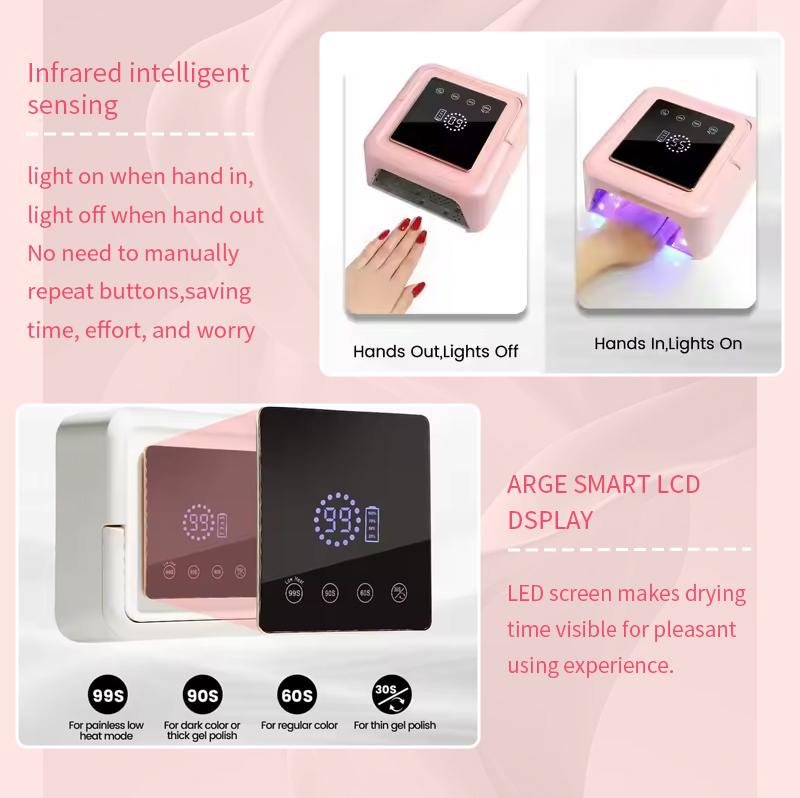 Esta lámpara de secado rápido de esmalte de uñas en gel de alta calidad garantiza un secado uniforme del pegamento sin encogimiento. Sus fuentes de luz duales proporcionan un calentamiento suave para evitar la decoloración de las manos y la fatiga visual, adecuadas tanto para manos como para pies, brindando resultados de secado notablemente rápidos.