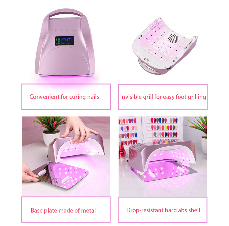 La apariencia de producto de la lámpara de esmalte de uñas recargable 96W tiene un diseño de ranura, el mango en el surco se puede usar como un papel de mango portátil, lo que hace que sea más conveniente llevar y poner. También evita la desventaja de que el mango se rompa fácilmente y se suelte.