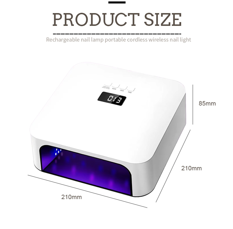 Las dimensiones de esta lámpara de secado rápido de uñas de alta calidad son 210 mm de largo, 210 mm de ancho y 85 mm de alto, con una gran capacidad y la posibilidad de usar tanto las manos como los pies, lo cual es muy conveniente.