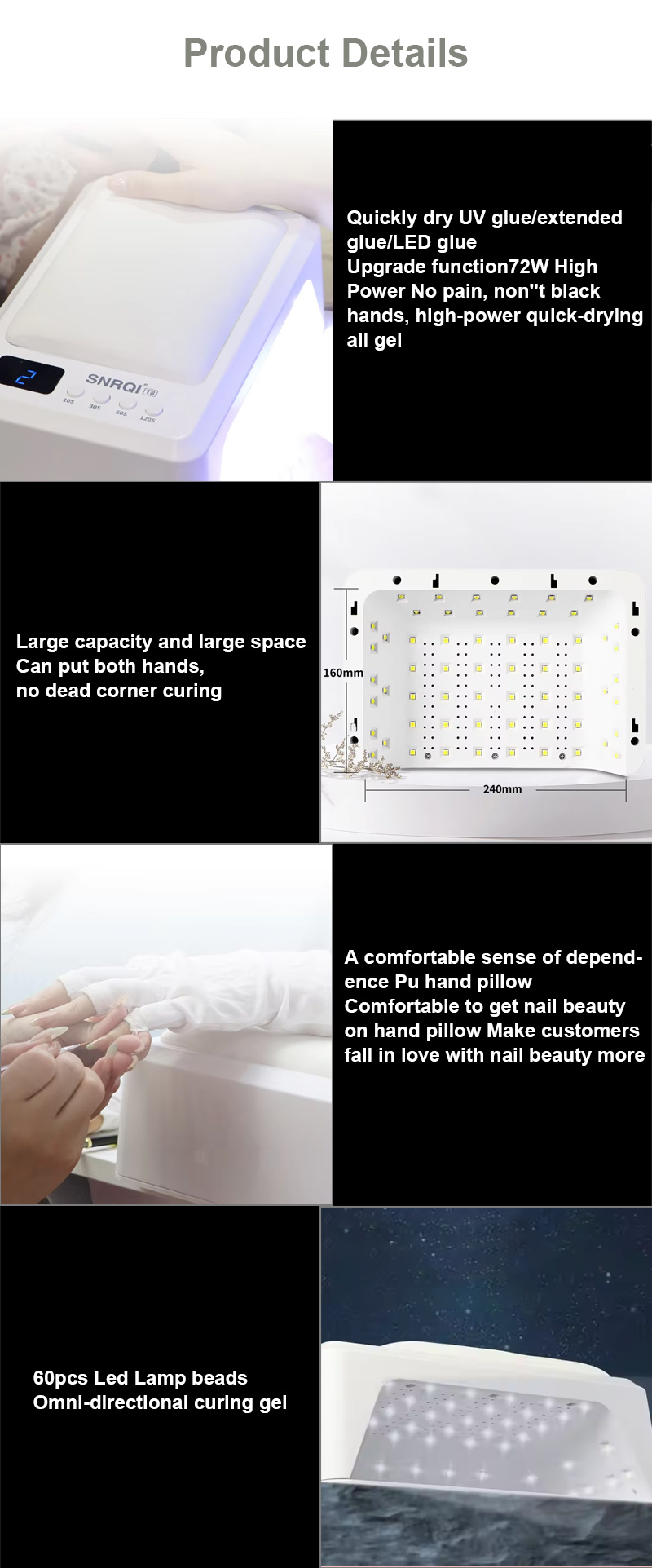 El producto garantiza un secado uniforme del pegamento sin encogimiento. Sus fuentes de luz duales proporcionan un calentamiento suave para evitar la decoloración de las manos y la fatiga visual, adecuadas tanto para manos como para pies, brindando resultados de secado notablemente rápidos.