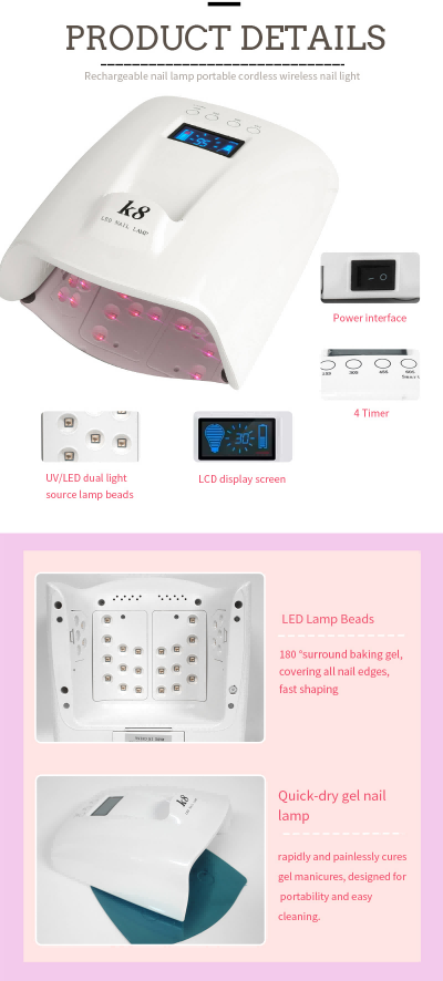 La lámpara de secado de uñas de gran capacidad con mango garantiza un secado uniforme del pegamento sin encogimiento. Sus fuentes de luz duales proporcionan un calentamiento suave para evitar la decoloración de las manos y la fatiga visual, adecuadas tanto para manos como para pies, brindando resultados de secado notablemente rápidos.