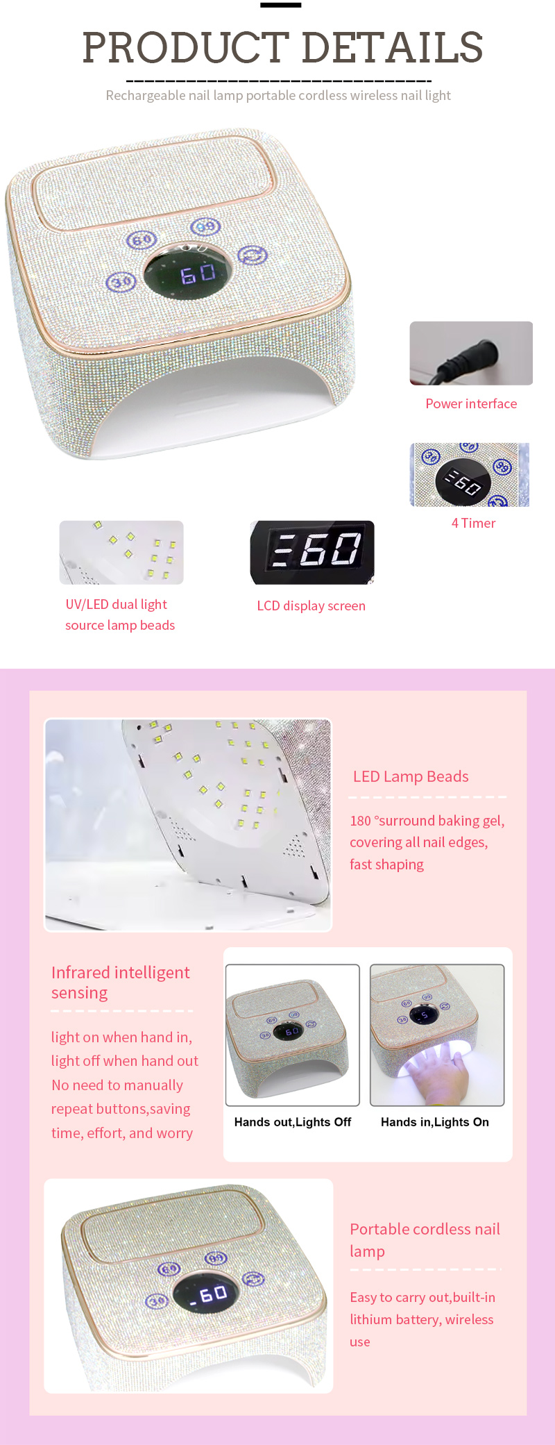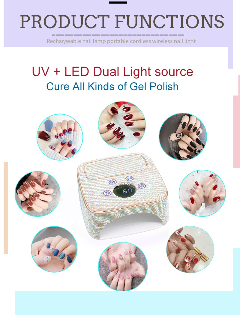 1, cuentas LED de doble fuente de luz, puede hornear una variedad de pegamento para uñas y pegamento funcional.