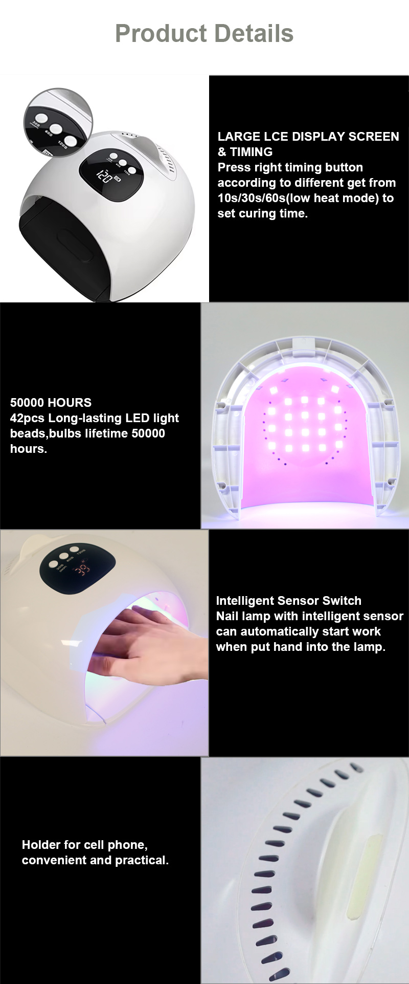 El producto garantiza un secado uniforme del pegamento sin encogimiento. Sus fuentes de luz duales proporcionan un calentamiento suave para evitar la decoloración de las manos y la fatiga visual, adecuadas tanto para manos como para pies, brindando resultados de secado notablemente rápidos.