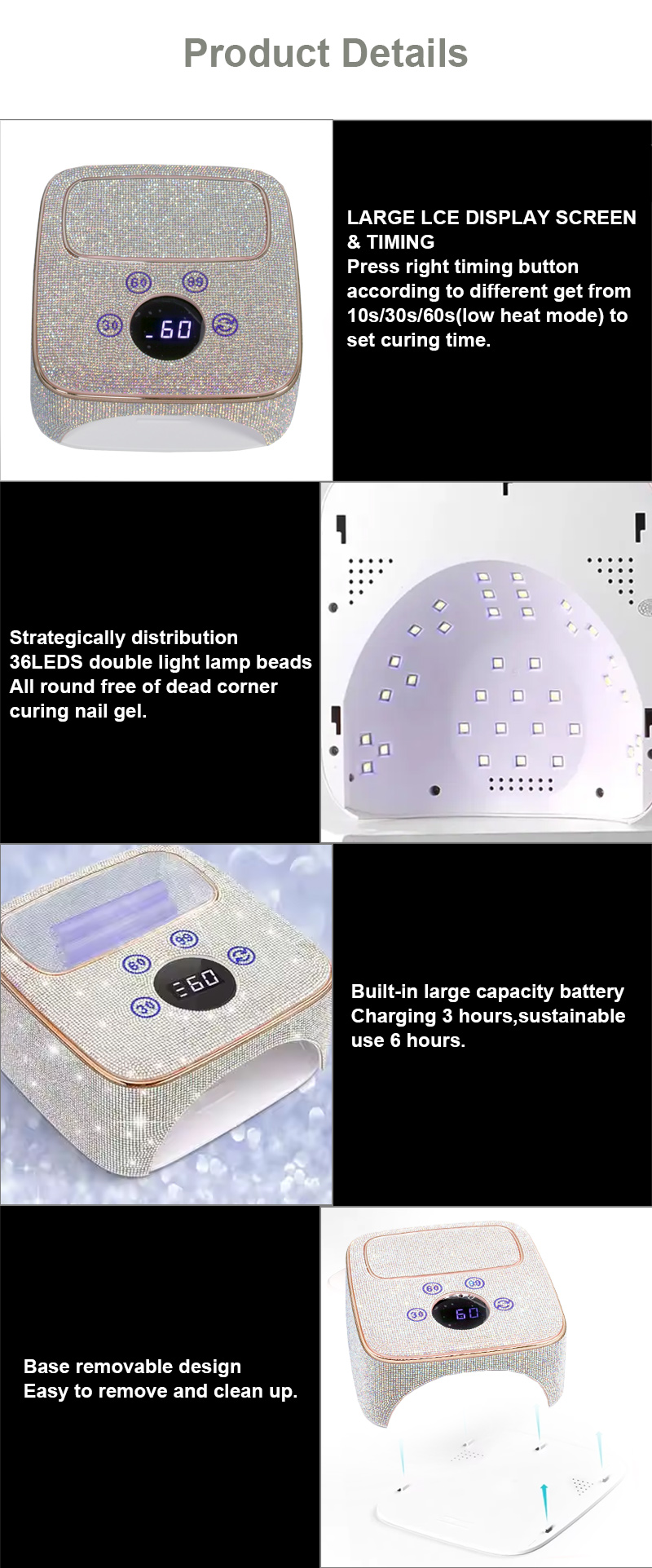El producto garantiza un secado uniforme del pegamento sin encogimiento. Sus fuentes de luz duales proporcionan un calentamiento suave para evitar la decoloración de las manos y la fatiga visual, adecuadas tanto para manos como para pies, brindando resultados de secado notablemente rápidos.