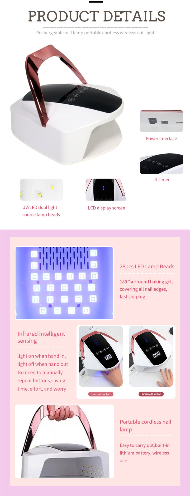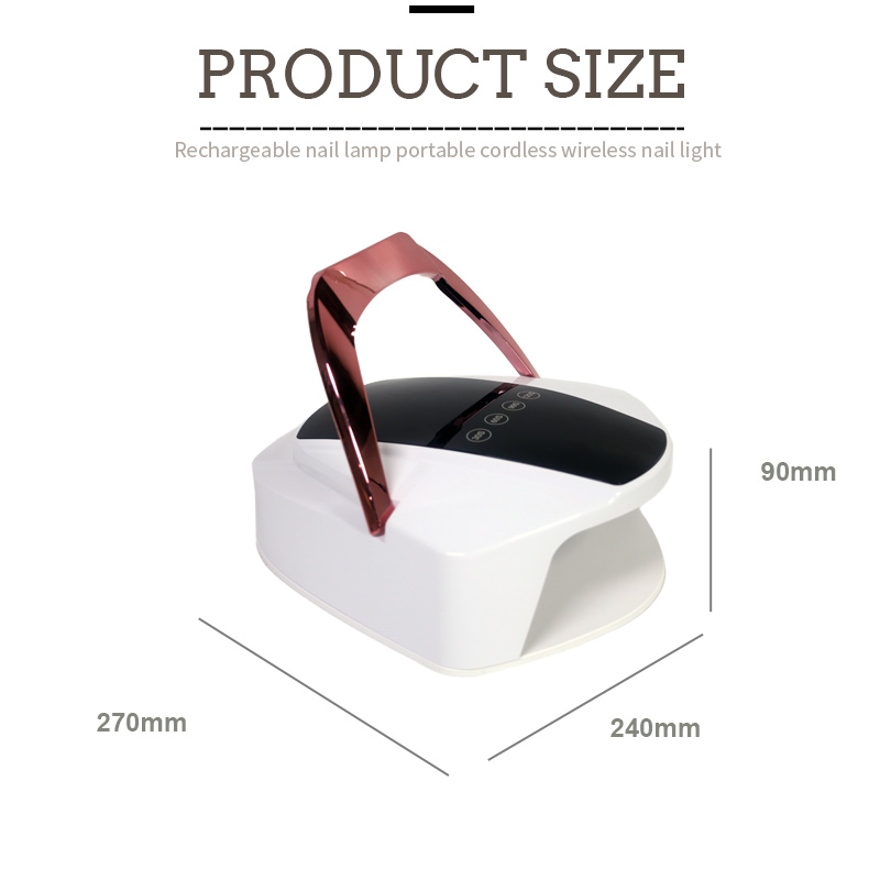 La apariencia de producto de la lámpara de esmalte de uñas recargable 90W tiene un diseño de surco, el mango en el surco se puede usar como un rol de mango portátil, lo que hace que sea más conveniente llevar y poner. También evita la desventaja de que el mango se rompa fácilmente y se suelte.