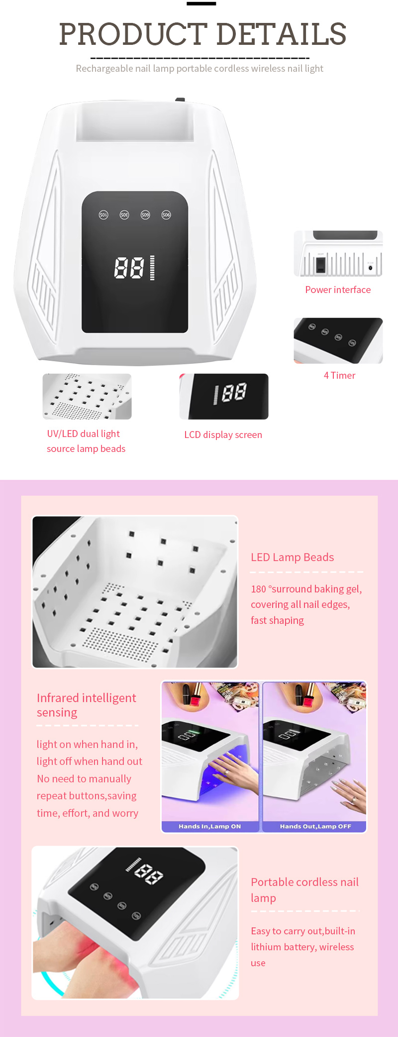 La apariencia de productos de la lámpara de esmalte de uñas recargable, la apariencia del producto 120W, tiene un diseño de surco, el mango en el surco se puede usar como un papel de mango portátil, lo que hace que sea más conveniente llevar y poner. También evita la desventaja de que el mango se rompa fácilmente y se suelte.